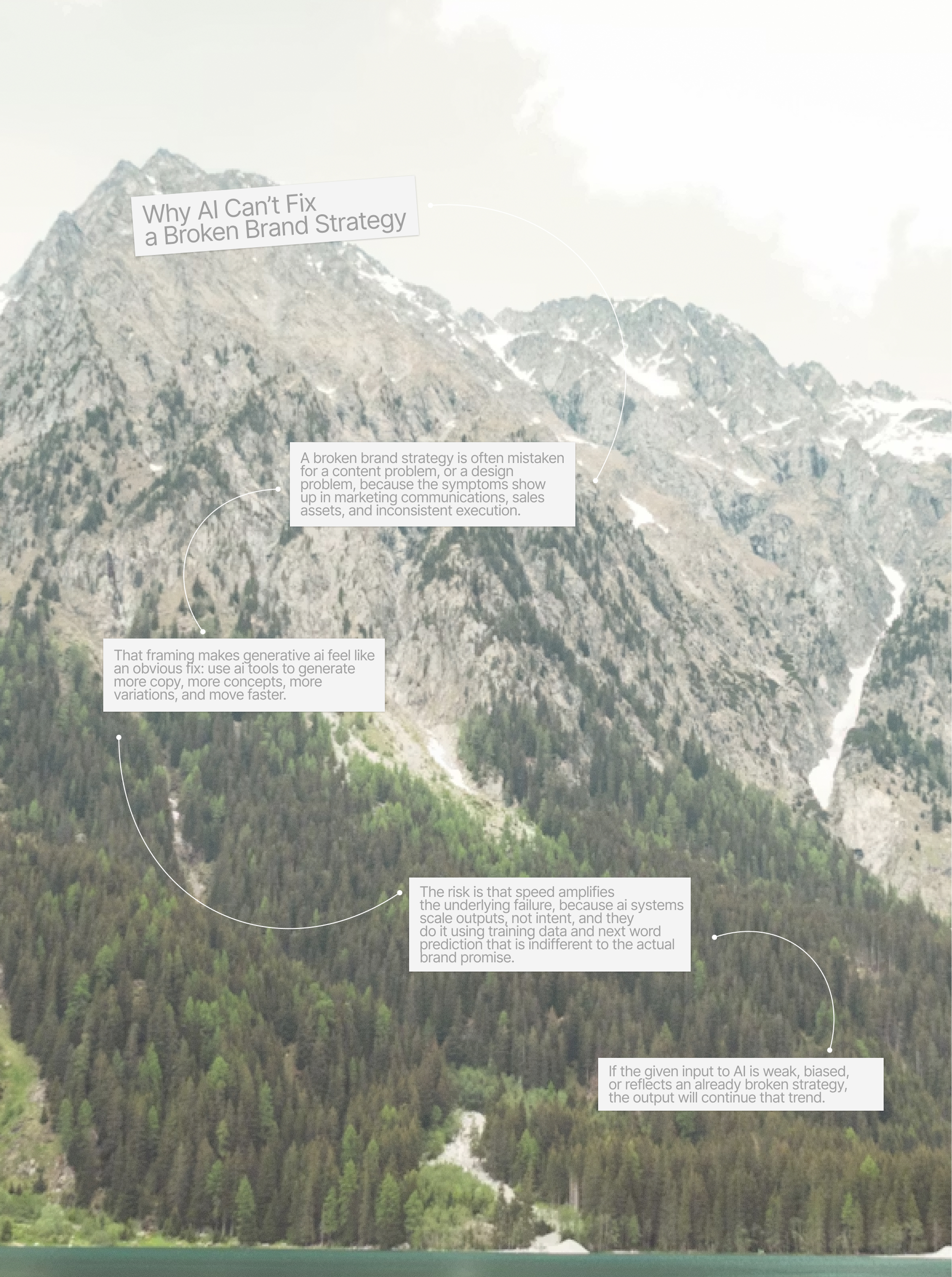 A broken brand strategy is often mistaken for a content problem, or a design problem, because the symptoms show up in marketing communications, sales assets, and inconsistent execution. That framing makes generative ai feel like an obvious fix: use ai tools to generate more copy, more concepts, more variations, and move faster. The risk is that speed amplifies the underlying failure, because ai systems scale outputs, not intent, and they do it using training data and next word prediction that is indifferent to the actual brand promise. If the given input to AI is weak, biased, or reflects an already broken strategy, the output will continue that trend.