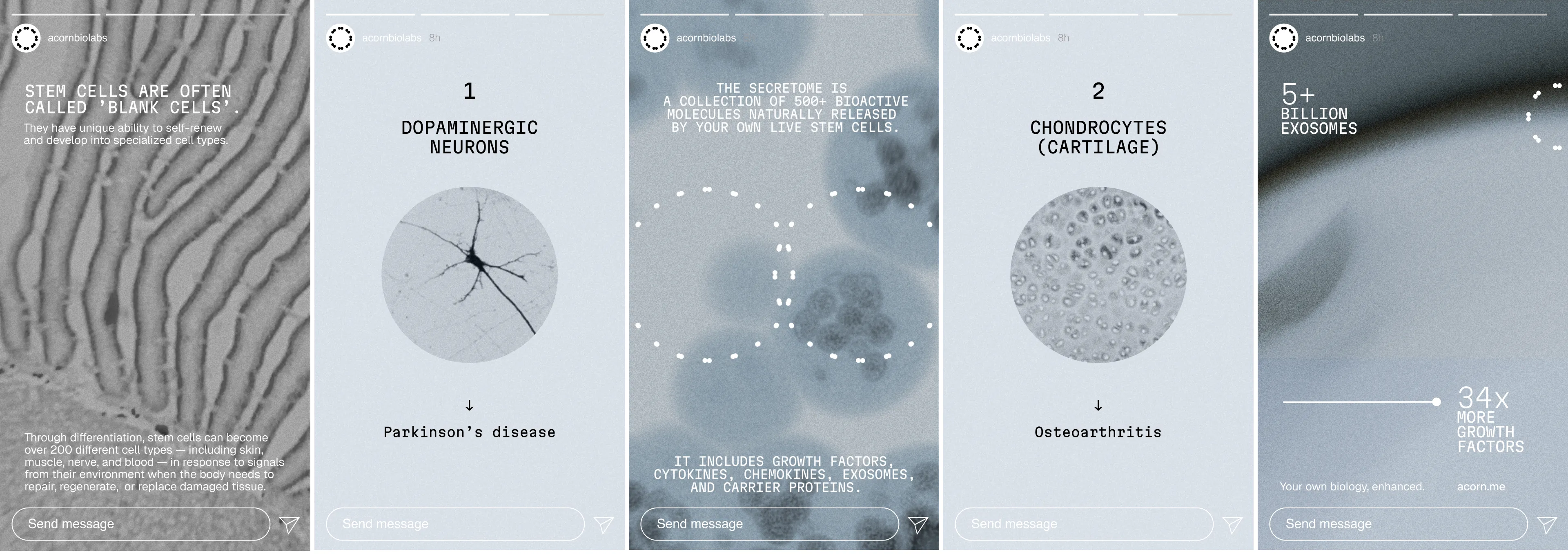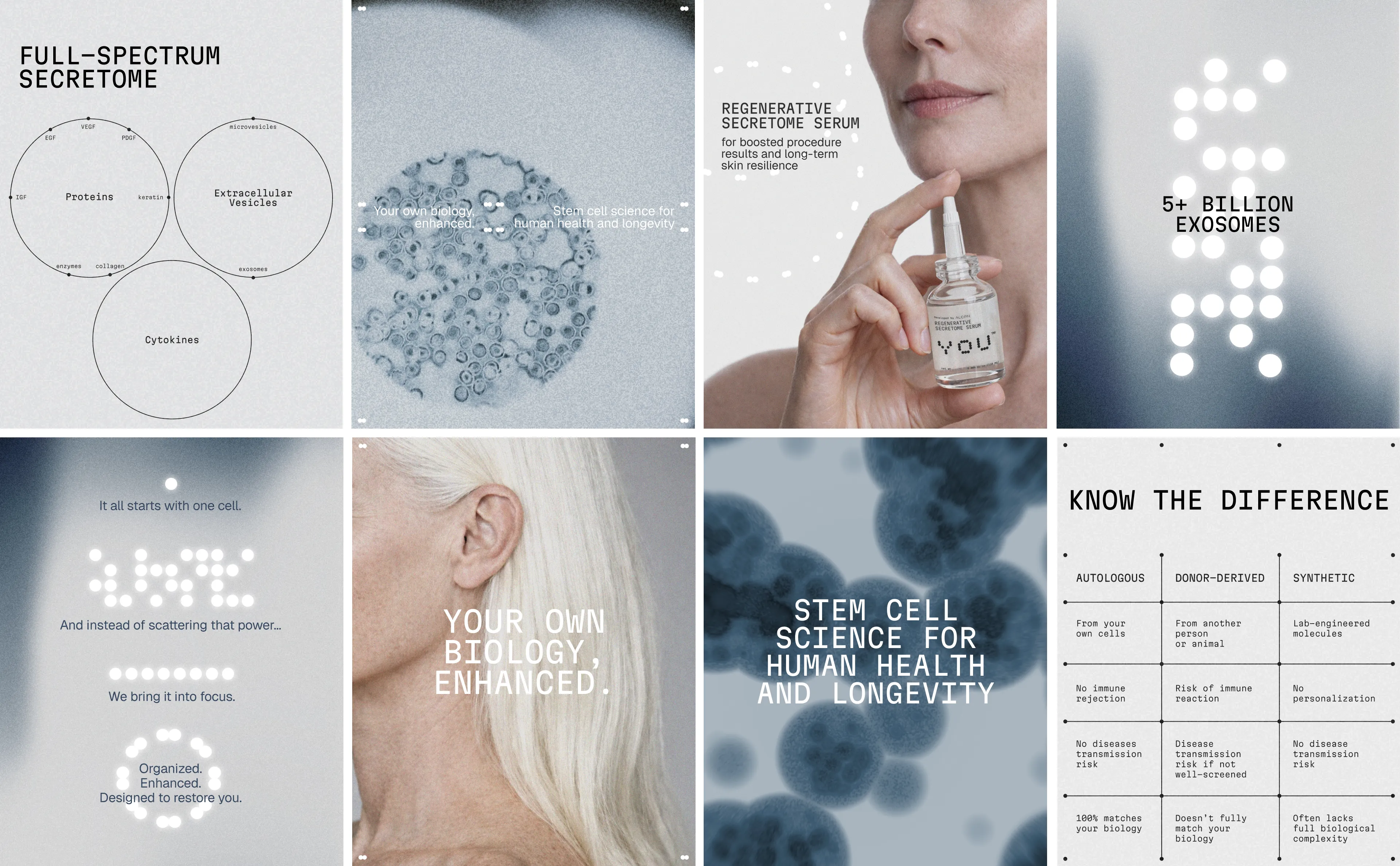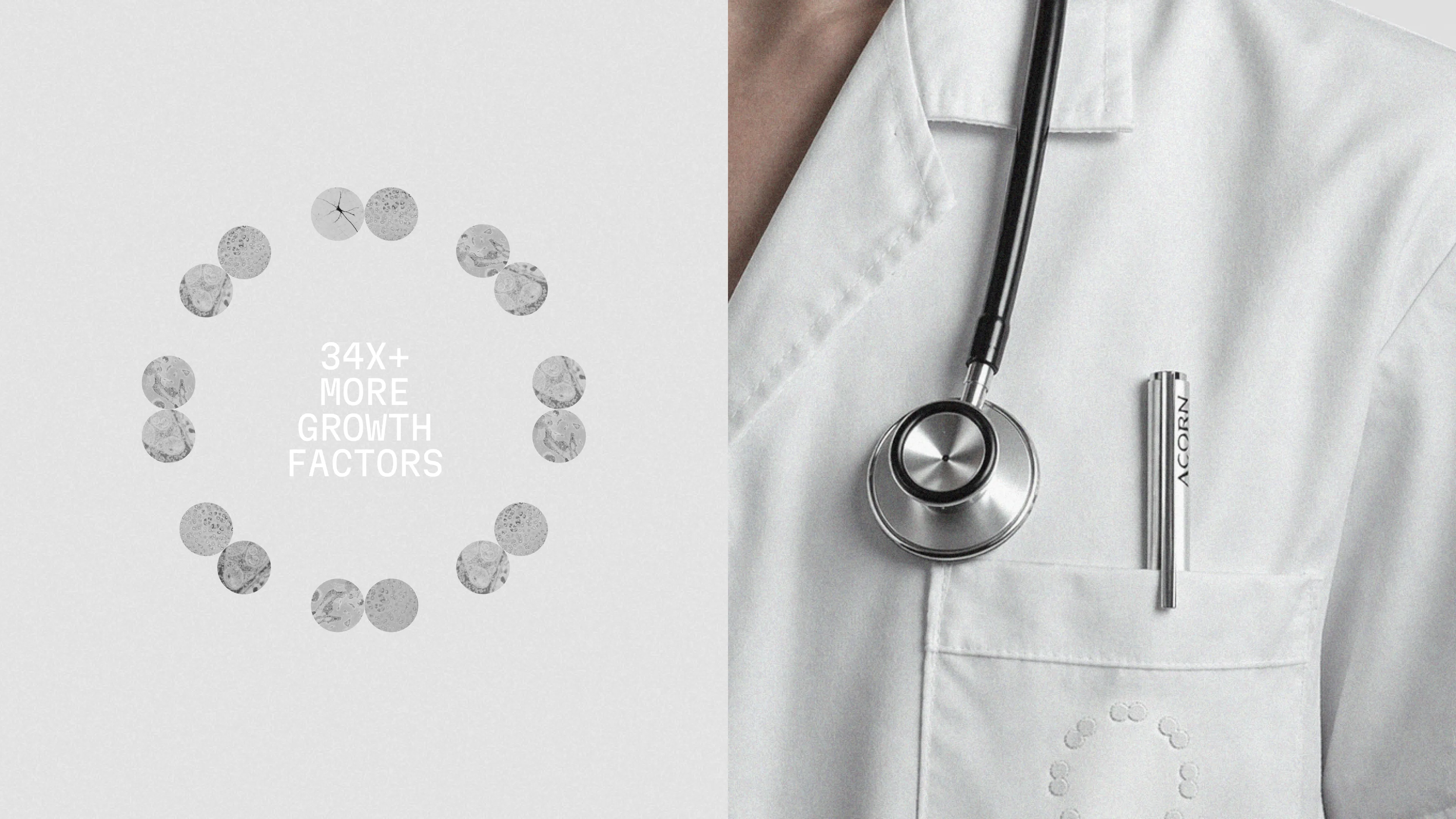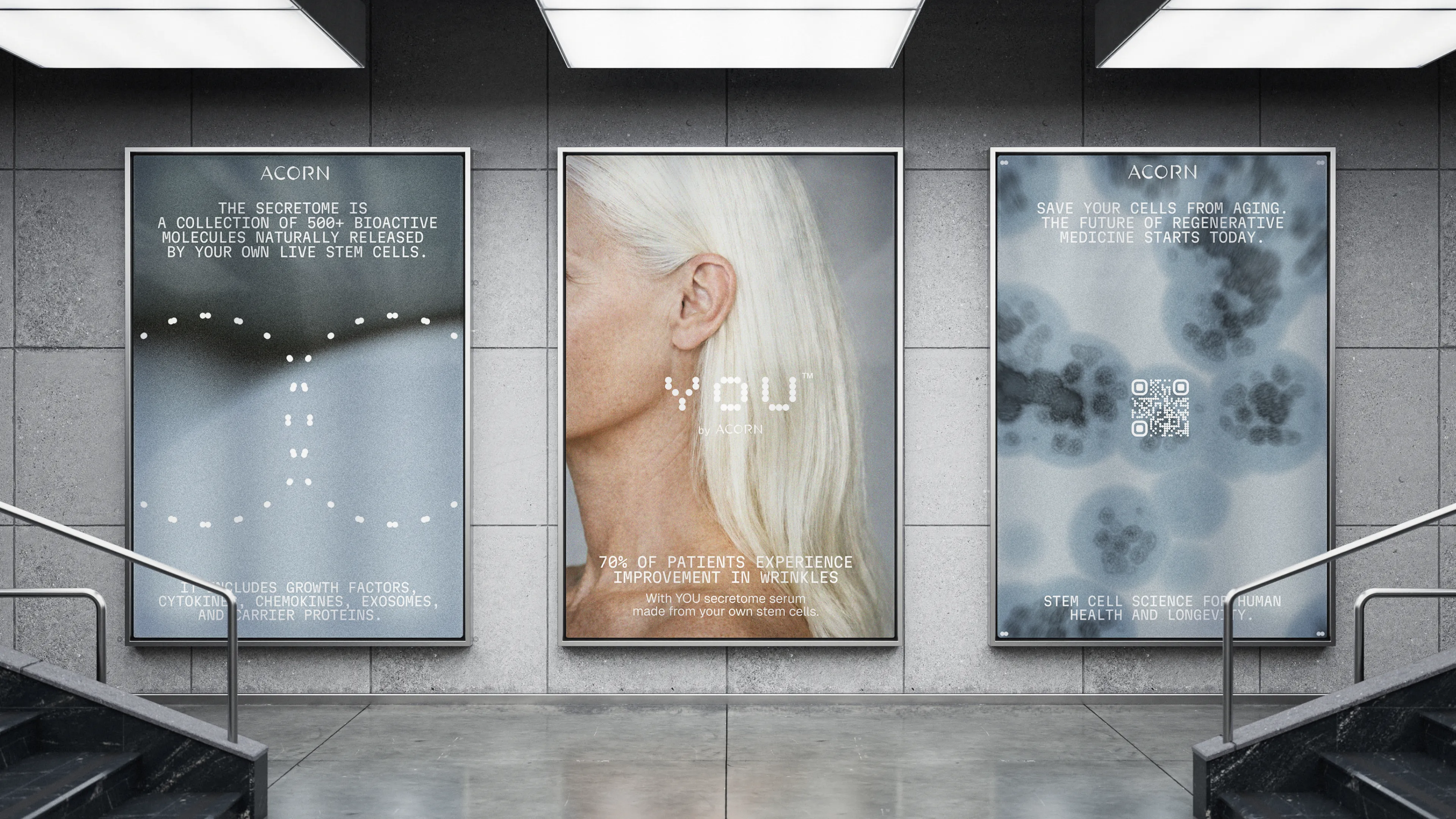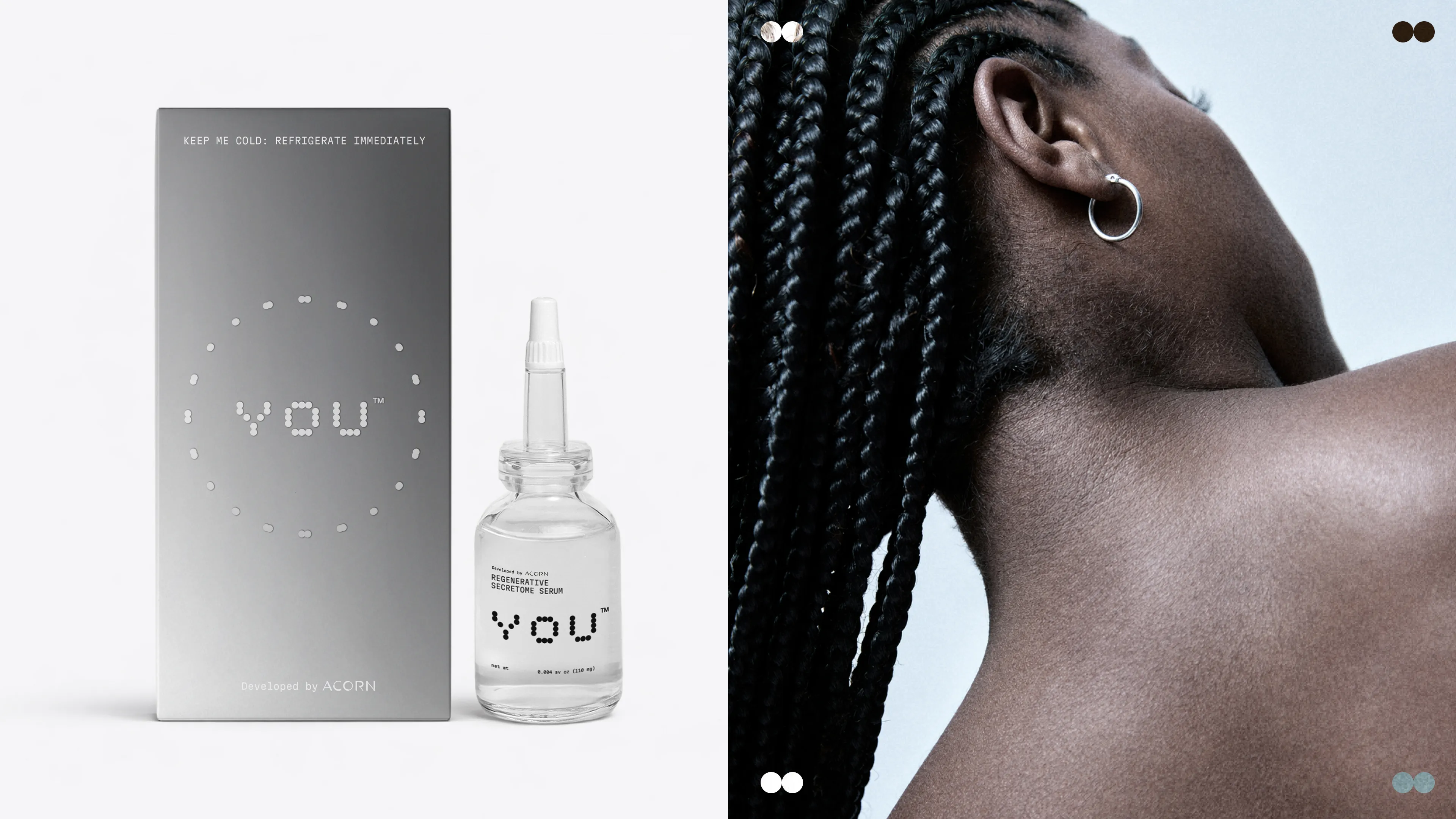 Acorn is building the world’s first hair follicle stem cell platform, and a technology company on the frontier of regenerative medicine. At the same time, they are launching You by Acorn, a consumer facing brand that turns this science into tangible, highly personalized treatments. In practice, this meant we were not working with one brand, but with a dual-brand ecosystem: Acorn as the clinical, biotech innovator; You as the intimate, human experience.